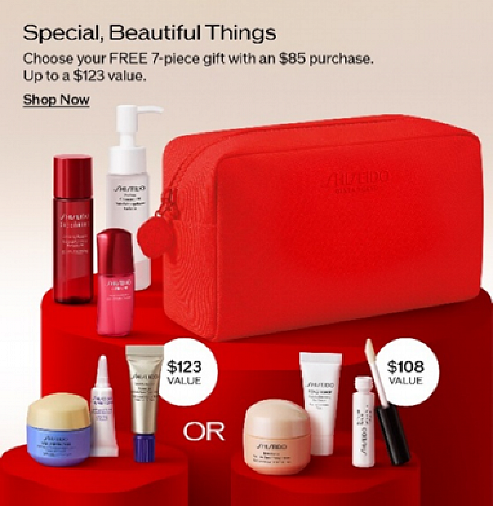 Choose a FREE 7-piece gift with your $85 Shiseido purchase.
